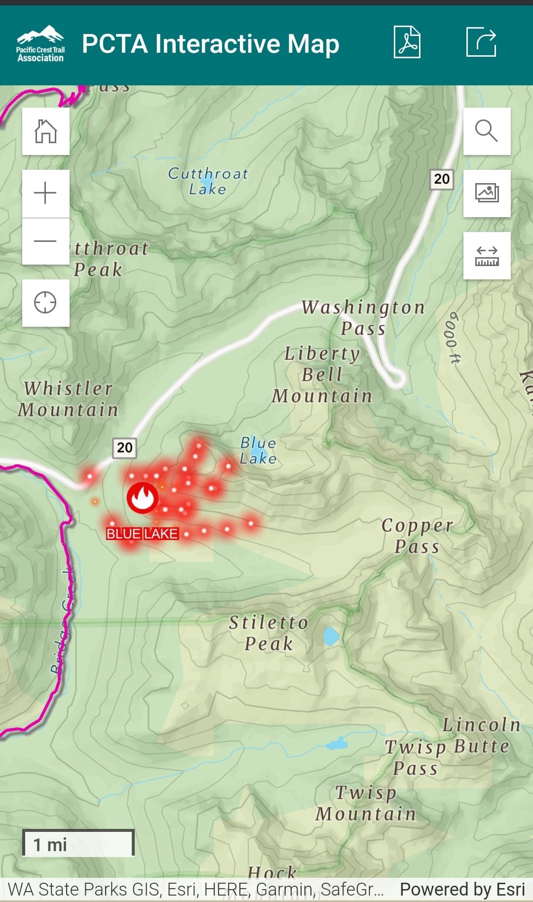 It is now estimated to be around 215 acres. The fire is burning just south of State Route 20 and near popular hiking and climbing trails, such as Blue Lake, Heather Maple Pass, and the Pacific Crest Trail near Bridge Creek.