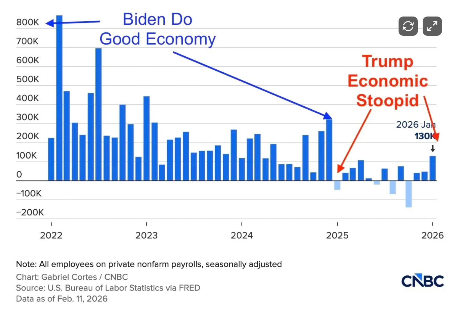 In 2023, under Joe Biden, the economy added 3 million jobs. In 2024, still under Biden, it added 2.2 million jobs. In 2025, under Trump, it added just 181,000 jobs.