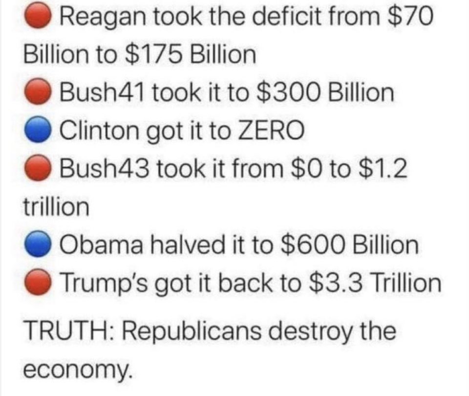 “Conclusion: By looking at the federal deficit or surplus based on fiscal year, the data in this report show all four Republican presidents since 1980, with our methodology, increased the federal deficit during their time in office: Ronald Reagan had a 94% increase, George H.W. Bush had a 67% increase, George W. Bush had a 1,204% increase, and Trump had a 317% increase.