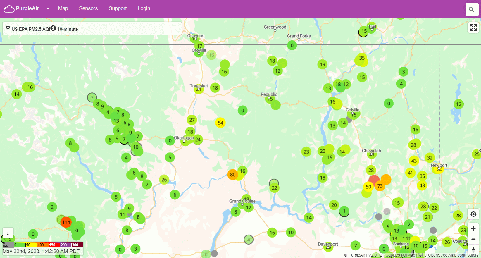 The Purple Air program shows many particulate monitors of PM2.5 (smoke) for our local area...