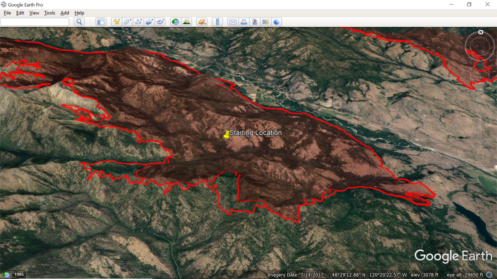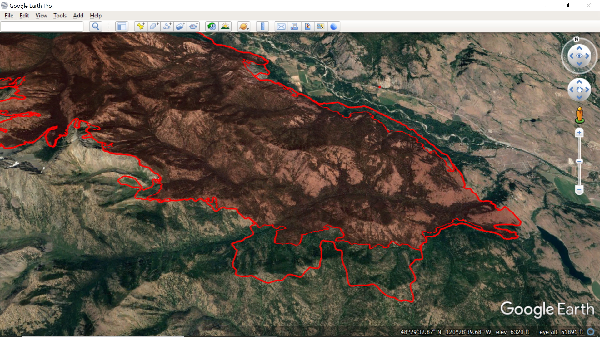 Evening NFIC fire perimeter draped on google earth. Shows major growth from yesterdays shaded area slopping over Thompson Ridge into Vincent Creek.