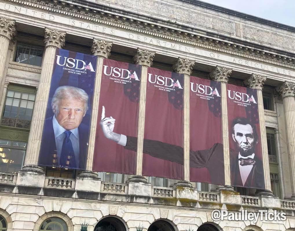 FELON donnie had a banner of his-own-self posted at the entrance to the main building, in DC, where USDA headquarters is located. There has been a Lincoln banner there for a while.