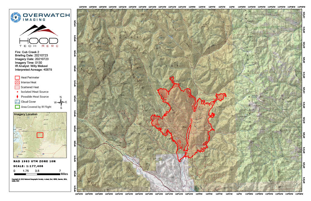 Infrared heat detection map of Cub Creek 2 fire perimeter, July 23, 2021. The fire in the Methow Valley began July16 five miles north of Winthrop WA,