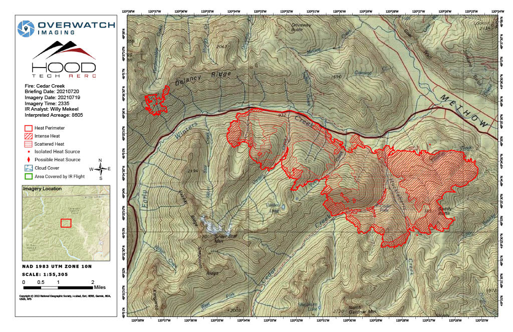 Cedar Creek Fire is burning south and west of State Route 20. Yesterday activity picked up in the Huckleberry and Cedar Creek drainages along the southeastern flank of the fire. The southeast portion of the fire pushed to the top of Sandy Butte where growth slowed. The northeastern anchor point using Forest Service Road 200 was compromised last night by a handful of spot fires. Resources will utilize a contingency line off of Forest Service Road 100 while exploring options to potentially bring the fire down to State Route 20. Crews continue to prepare contingency line along Early Winters Creek. Forecasted winds from the west this afternoon could increase spread along the eastern flank. Aerial resources will be used to decrease fire activity along the eastern perimeter.