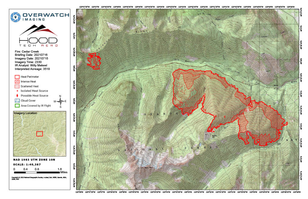 Cedar Creek and Delancy fire perimeters near Mazama, WA. July 16, 2021