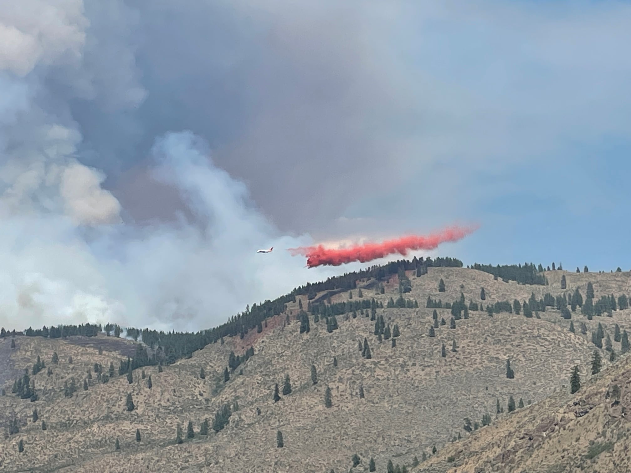 Firefighters are utilizing a suite of aircraft this afternoon on the Cub Creek 2 Fire, including this airtanker making a retardant drop on a ridgeline adjacent to Ramsey Peak.