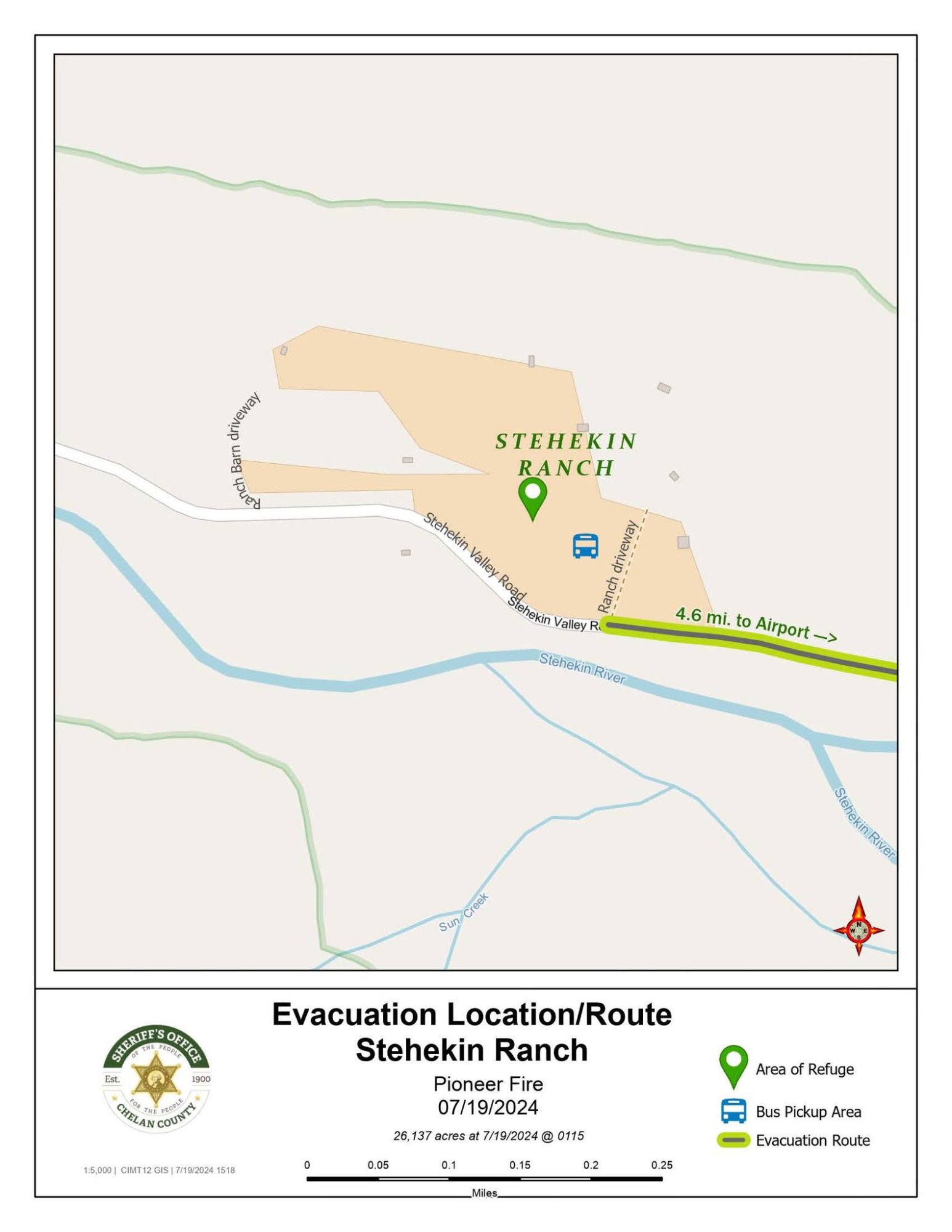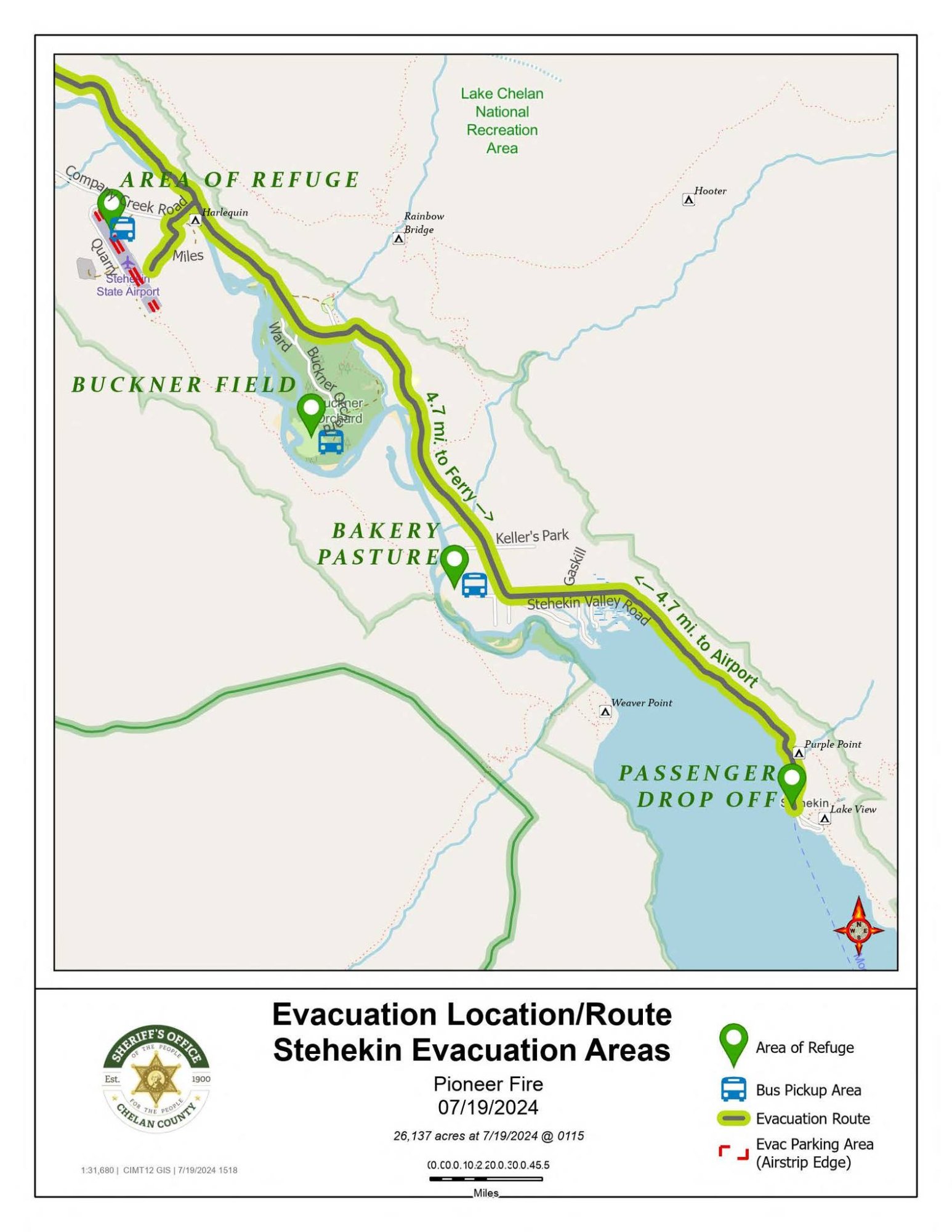 Areas of Refuge, with shuttle service, have also been established at the Stehekin Ranch, airfield, Buckner Orchard and Stehekin bakery. See the attached evacuation routes and locations.