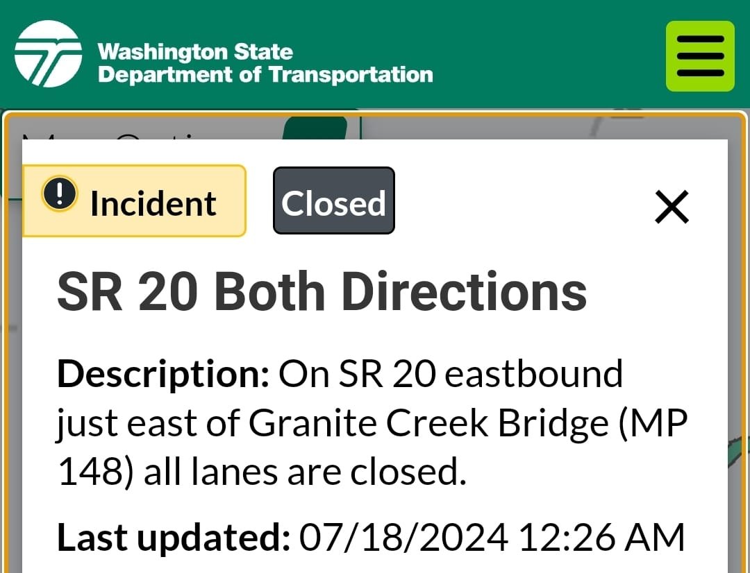 Closures: Trails: Pacific Crest Trail in the Easy Pass/Rainy Pass area is closed as well as the Heather Maple Pass Trail due to closed road access. More details on other area trail closures will be shared as they become available. Roads: Highway 20 (North Cascades Highway) is fully closed between Granite Creek (MP 148) and east of the Rainy Pass Trail Head (MP 158) due to wildfire activity. Please check Washington State Department of Transportation information at https://wsdot.com/Travel/Real-time/Map/