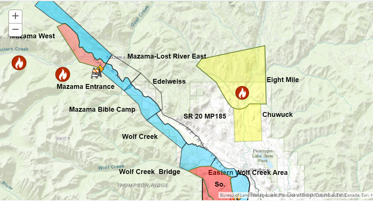 The Forest Service Fire Emergency Area Closure is separate from the Washington State Department of Transportation’s (WSDOT) closure of portions of State Route 20 and may change or be lifted at various times depending on operational needs. WSDOT is working closely with the Forest Service and Okanogan County to identify where fire activity and firefighting operations warrant closure.
