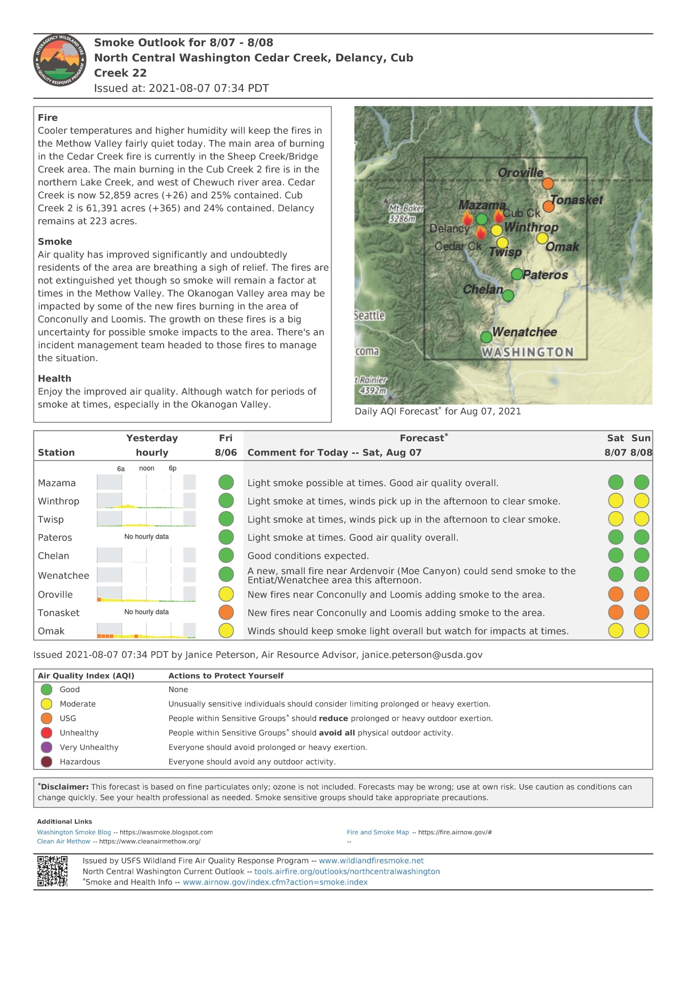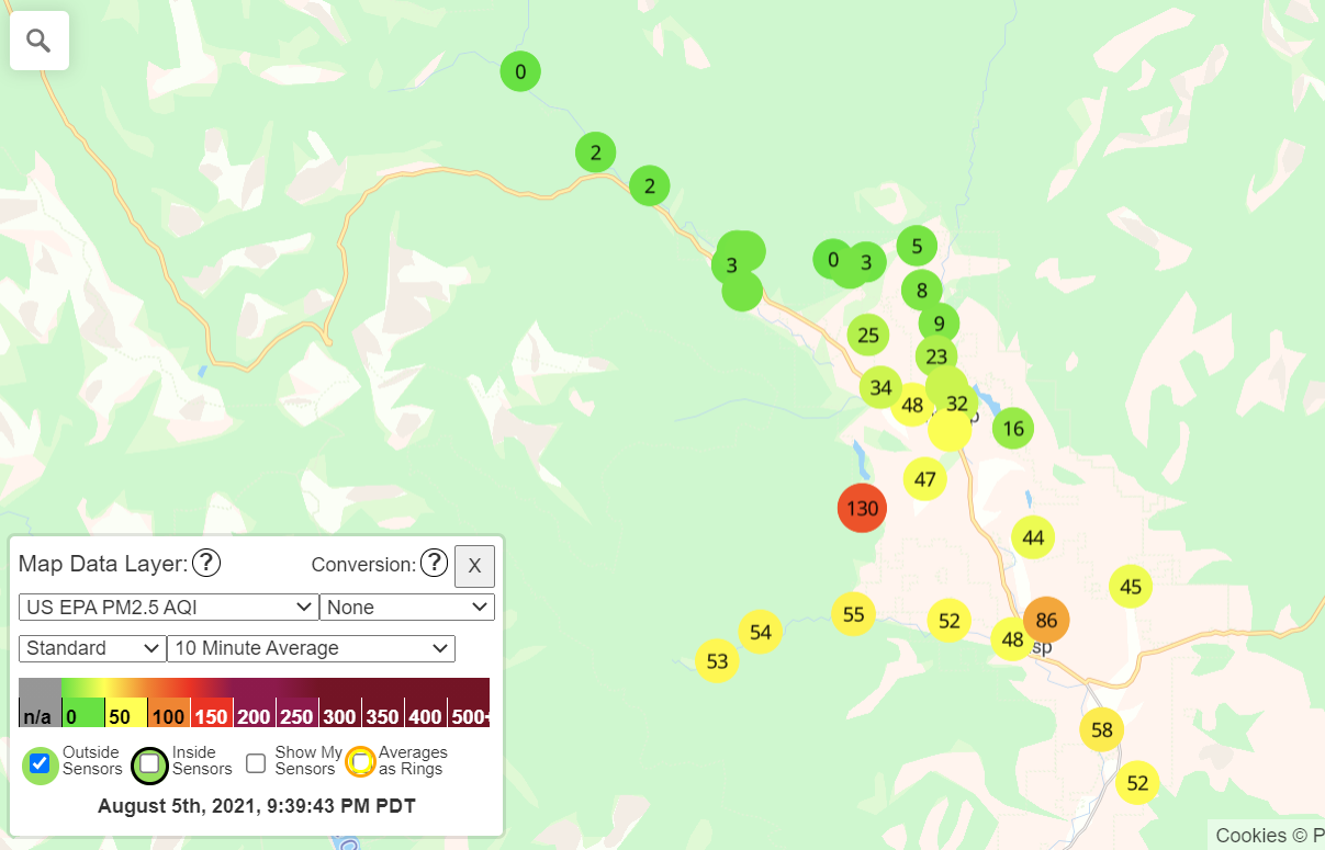Air Quality: Air quality has improved significantly and undoubtedly residents of the area are breathing a sigh of relief. The fires are not extinguished yet though so smoke will remain a factor at times in the Methow Valley. The Okanogan Valley area may be impacted by some of the new fires burning in the area of Conconully and Loomis. The growth on these fires is a big uncertainty for possible smoke impacts to the area. There's an incident management team headed to those fires to manage the situation.