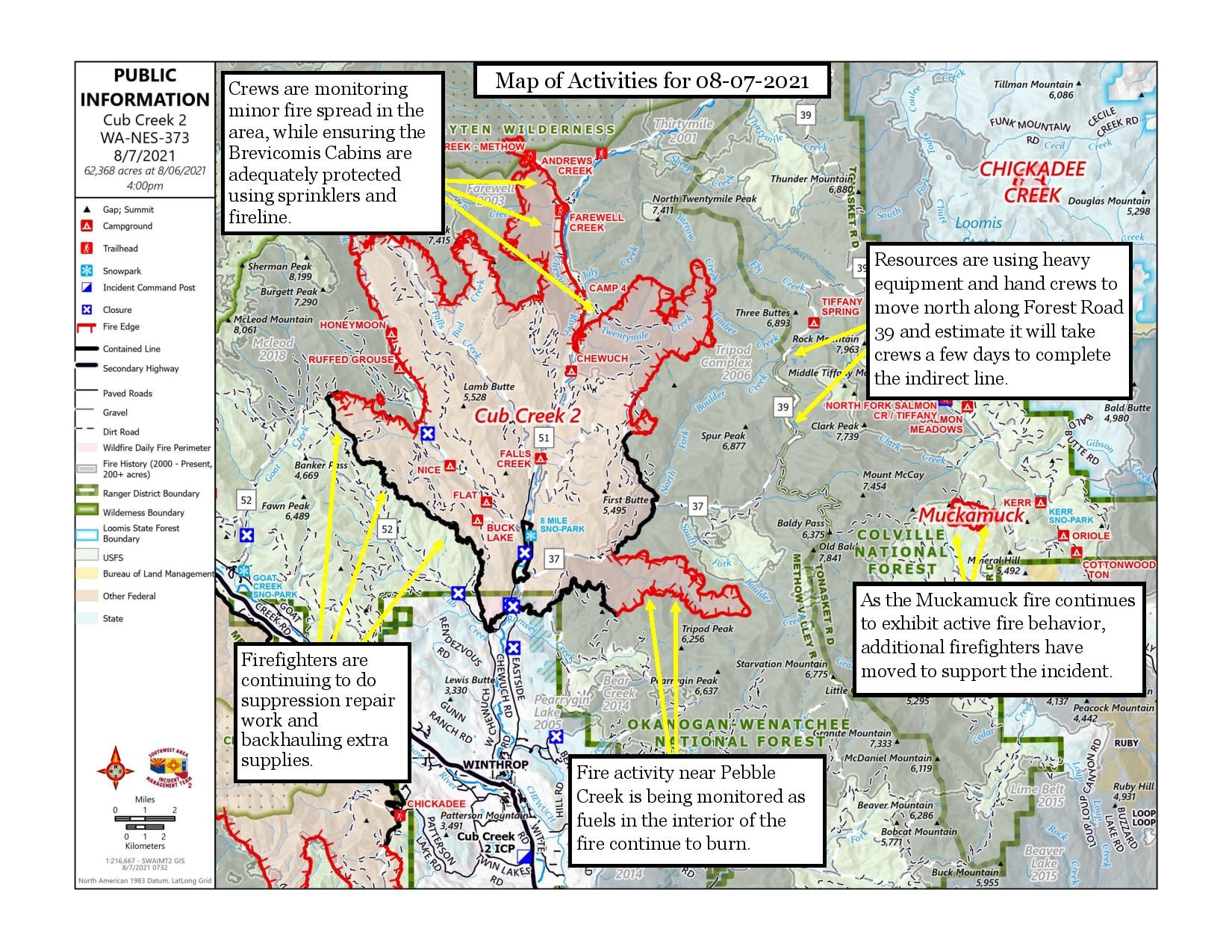 Crews continued to improve containment features in the Silver Star Creek – Vasiliki Ridge area. Their objective is to keep fire out of the Early Winters Creek and east of WA-20.