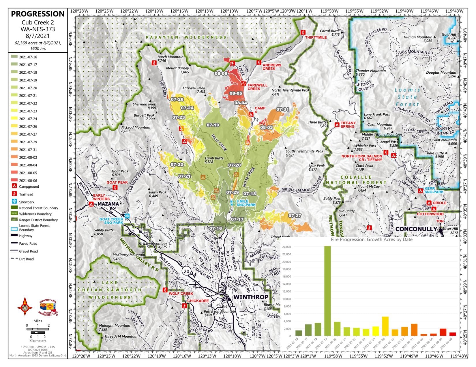 Firefighters were able to contain a new ignition near the western flank of the fire. Ground and air resources supported local resources for initial attack efforts in the vicinity of the fire, including the Muckamuck Fire and Schneider Springs Fire. Firefighters were able to mop up the western side of FS 51 and the Lake Creek Methow Trailhead from the firing operation.