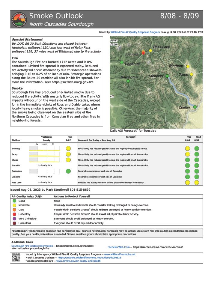 Smoke: Smoke from the Sourdough Fire may affect communities around the region. Information about current conditions and a smoke forecast is located at: https://wasmoke.blogspot.com.