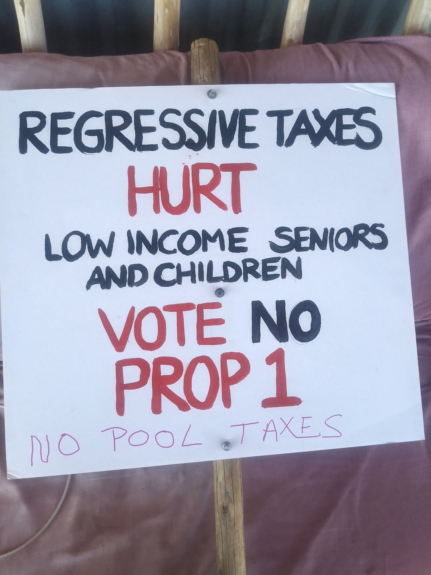 I got there around 10AM and did a circle around the market with my sign until I settled for a while right near the HWY. Great spot for visibility Plus it was right next to the Yes on Pools Yes on Propostion 1 table.