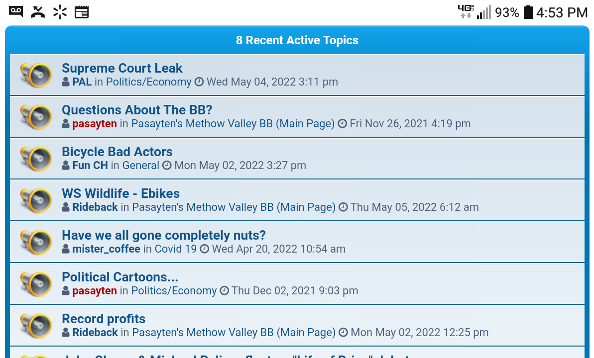 It shows both... At the left is who started it, and the right column is who made last post... If on phone, turn sideways in landscape position to see all columns...Fun CH wrote: Wed May 04, 2022 6:13 pm It would help if the index page showed who made the last post on a thread rather than who started the thread.